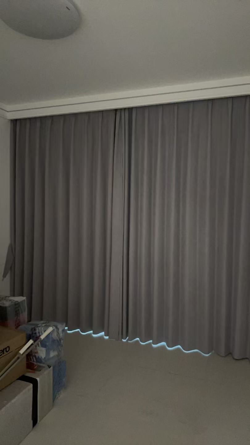 结合现场采光条件(客厅南向采光充足,午后阳光直射)与硬装色调,我现场为业主展示了两款定制窗帘的实景效果,逐一讲解细节与适配性。两款窗帘均采用加厚雪尼尔面料,搭配全屋满墙窗帘盒安装,韩褶高温定型工艺让褶皱均匀笔直,垂坠感十足,没有多余的装饰纹路,完美契合极简风的设计内核。